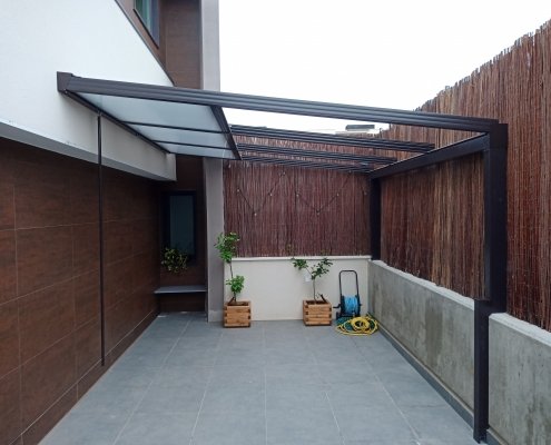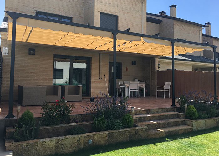 Este tipo de pérgola sirve para dar protección contra el sol, lluvia o frío. Tiene una estructura de aluminio con cubierta de lona, la cual es impermeable.
